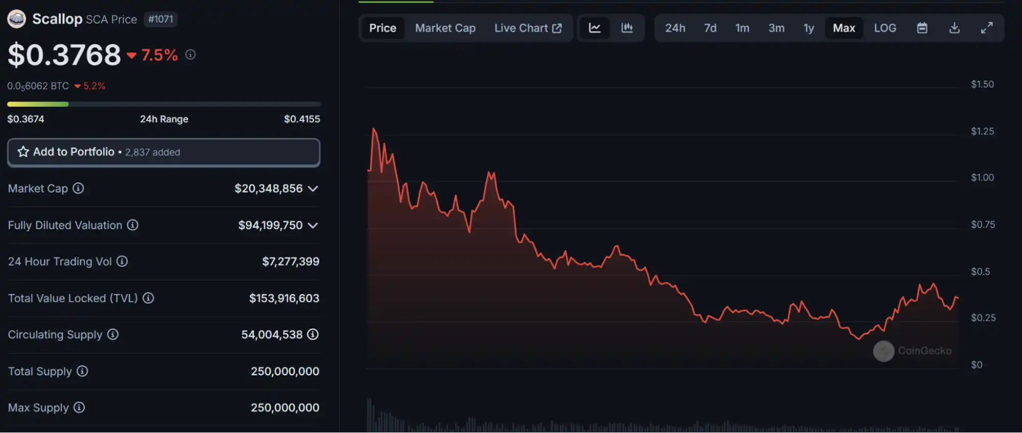 SCA 代币价格约为 0.376,历史新高 1.28,当前市值 2034 万。