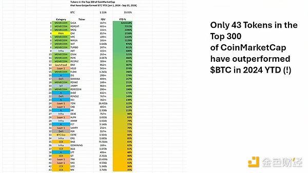 如上图所示,你会发现今年迄今为止只有 43 种代币的表现优于比特币,而排名前 20 的代币中有 13 种是模因币。