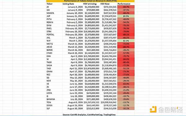 2024 年所有在币安上推出的新代币,除了两个例外,每个项目都下跌了。一个例外是 Whiff,这个代币自上市以来几乎没有增长,另一个是 Jupiter,它与迷因币的交易基础设施密切相关。这些事实发出了一个强烈的信号:大多数新发行的山寨币项目表现并不理想。