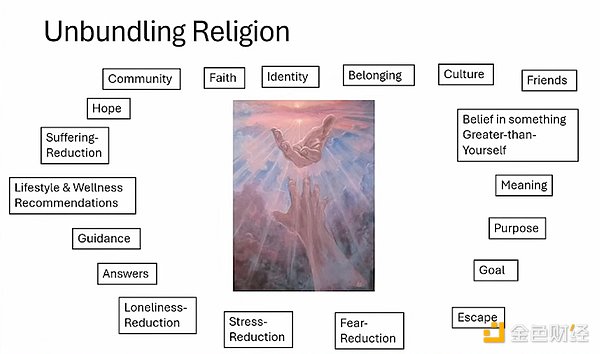 迷因币本质上是一把瑞士军刀,提供了一系列产品,它提供了身份认同、文化、逃避、减少孤独、社区、希望以及其他许多东西。我相信宗教在世界上的影响力正在减弱,而品牌、体验和社区正在填补这一空白。你已经可以在电子游戏、音乐节、瑜伽、DMT 静修、CrossFit、SoulCycle、生酮饮食,当然还有金融资产中看到这一点。