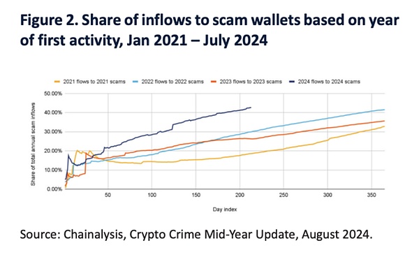 诈骗者的目标越来越广泛,尤其针对年轻人和华人社区。诈骗组织通常为复杂的金字塔式结构,包括招聘、财务和运营等多部门,这些犯罪活动的运作需要多方合作。过去一年,诈骗的形势也发生了变化,数据显示,今年以来的诈骗流入量中,有 43% 流向了新活跃的钱包,相比之下,2022 年的这一比例仅为 29.9%,这意味着新型诈骗的数量正在迅速增加。