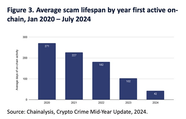 从 2020 年至今,诈骗活动的平均活跃天数显著减少,从 2020 年的平均 271 天下降到 2024 年上半年的 42 天。