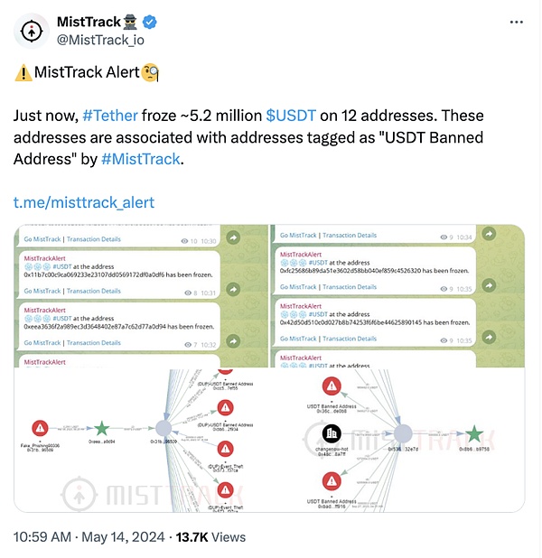 这⼀宏观趋势与诈骗者从精⼼策划的庞⽒骗局转向更有针对性的活动的变化相⼀致,还有部分原因是执法⼒度加⼤以及稳定币发⾏⼈越来越多地将诈骗地址列⼊⿊名单,如 5 月 14 日,链上追踪与反洗钱平台 MistTrack 监测到全球最大的稳定币发行商 Tether 冻结与网络钓鱼相关的 520 万 USDT: