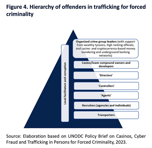 贩运者通过欺骗和胁迫受害者参与犯罪活动,获得经济利益。受害者在被贩运后通常会被限制自由,护照被扣押,面临暴力和各种威胁。尽管被强迫贩运的本质没有改变,但行业的专业化导致了受害者与自愿参与者之间的界限模糊,形成了多类相关人员。