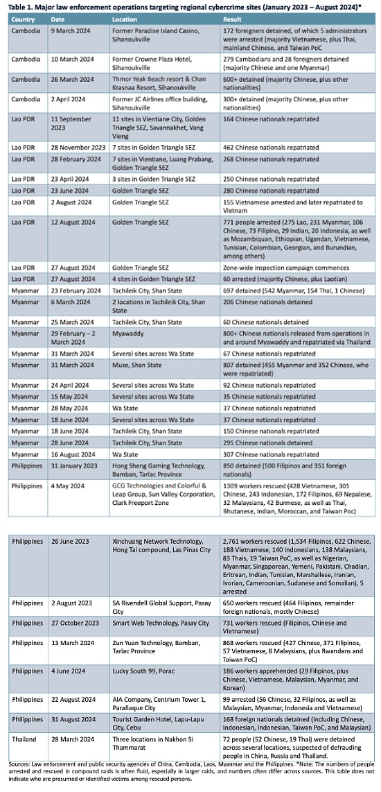 下表根据各地区执法机构的声明汇编⽽成,列出了⾃ 2023 年 1 ⽉以来针对⾮法在线赌博和⽹络欺诈活动的⽹站所采取的⼀些最突出的执法⾏动。这些突袭⾏动由当地执法机构主导,有时与地区执法机构合作。中国公安机关在其中⼏次⾏动中发挥了重要作⽤。
