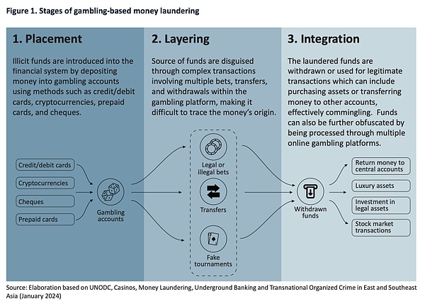 近年来,东亚和东南亚的执法机构也加强了对第三方支付提供商的监控,但很多案例显示网络诈骗依然对这个行业有着很大的影响。在在线赌博行业中,缺乏监管的赌场和博彩中介已经成为洗钱的重要基础设施。它们通过“保管”交易和“投资”来隐匿资金来源,形成了复杂的洗钱手段。由于在线赌博的匿名性和非面对面交易的特点,资金流动变得非常难以追踪,这为有组织犯罪提供了便利。