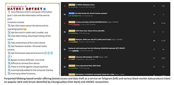 有强有⼒的证据表明,地下数据市场正在转向 Telegram,在东南亚蓬勃发展的犯罪⽣态系统背景下,信息窃取恶意软件和地下⽇志云 (UCL) 服务的激增是这⼀转变的核⼼,简单、可⽤和低信息窃取程序的成本使得它们成为特别受该地区犯罪分⼦欢迎的服务。这些工具通常通过恶意软件即服务(MaaS) 模式访问,开发⼈员将使⽤许可提供给其他⼈。这种不断增⻓的数据渠道为该地区的跨国有组织犯罪创造了⼤量新的机会,反过来⼜助⻓了从事⽹络欺诈的策略、技术、⽬标和犯罪集团的多样化。相关数据显示,亚太地区的待售信息窃取程序感染的主机数量持续增加,这与该地区的网络欺诈事件激增的趋势是一致的。