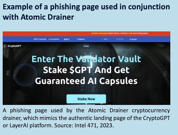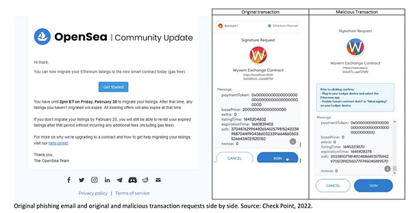 这种耗尽资产的手法,需要受害者在不知情的情况下将加密货币钱包连接到恶意合约,从⽽将加密货币和 NFT 转移到犯罪分⼦的钱包中。一个著名的案例是 2022 年犯罪分子针对非同质化代币(NFT) 市场 OpenSea 的用户发起的网络钓鱼攻击,导致超过 250 个 NFT 被盗,价值约 200 万美元。据安全研究⼈员称,犯罪分子利用 OpenSea 系统升级的机会,发送虚假的电子邮件,引诱用户进行操作,最终导致其资产被转移。