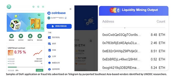 此外,越来越多的犯罪分⼦利⽤ Drainer 智能合约针对缺乏去中心化金融(DeFi) 知识的投资者。具体来说,这种诈骗手法通常会让受害者连接到伪造的流动性挖矿池,从而耗尽他们的钱包。在地下市场和论坛上很容易找到各种各样的 DeFi 应⽤套件,这些 DeFi 应用套件被宣传为合法的应用程序,实际上却是用于诈骗的。