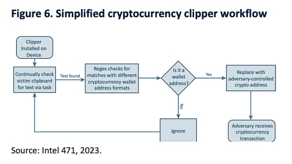 报告还提到,东南亚犯罪集团常用的一个恶意软件是剪切器。这种软件监控受感染系统的剪贴板,伺机替换加密货币交易中的地址,一旦受害者无意中进行交易,就会将资金转移到攻击者的地址上。由于加密钱包地址通常很⻓,导致用户不太会注意到收款地址的变化,从⽽增加了恶意软件的有效性。
