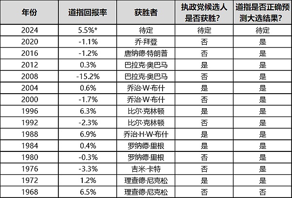 道指在大选日前11周的走势,与1968年以来执政党候选人是否赢得总统大选有关。