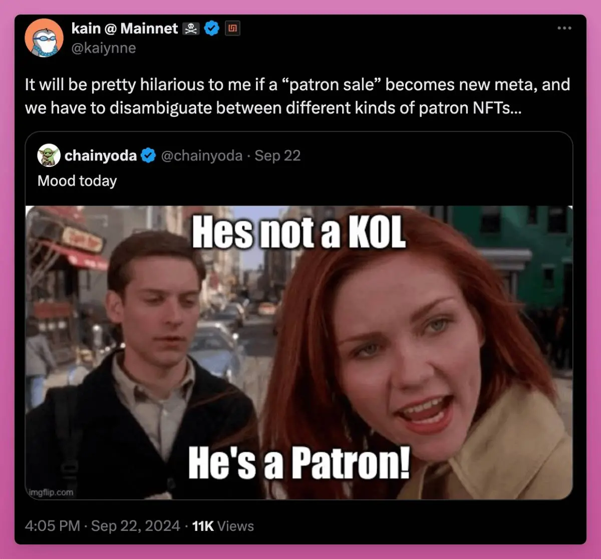 除了进行游戏化的收益农场活动,他还推出了 Patron NFT 销售。我收到 Kain 的一条私信,告诉我可以选择以下三种锁定和估值条款之一进行投资:无锁定、每年归属,或者 1 年悬崖期加 2 年归属期,并享受 75% 的折扣。