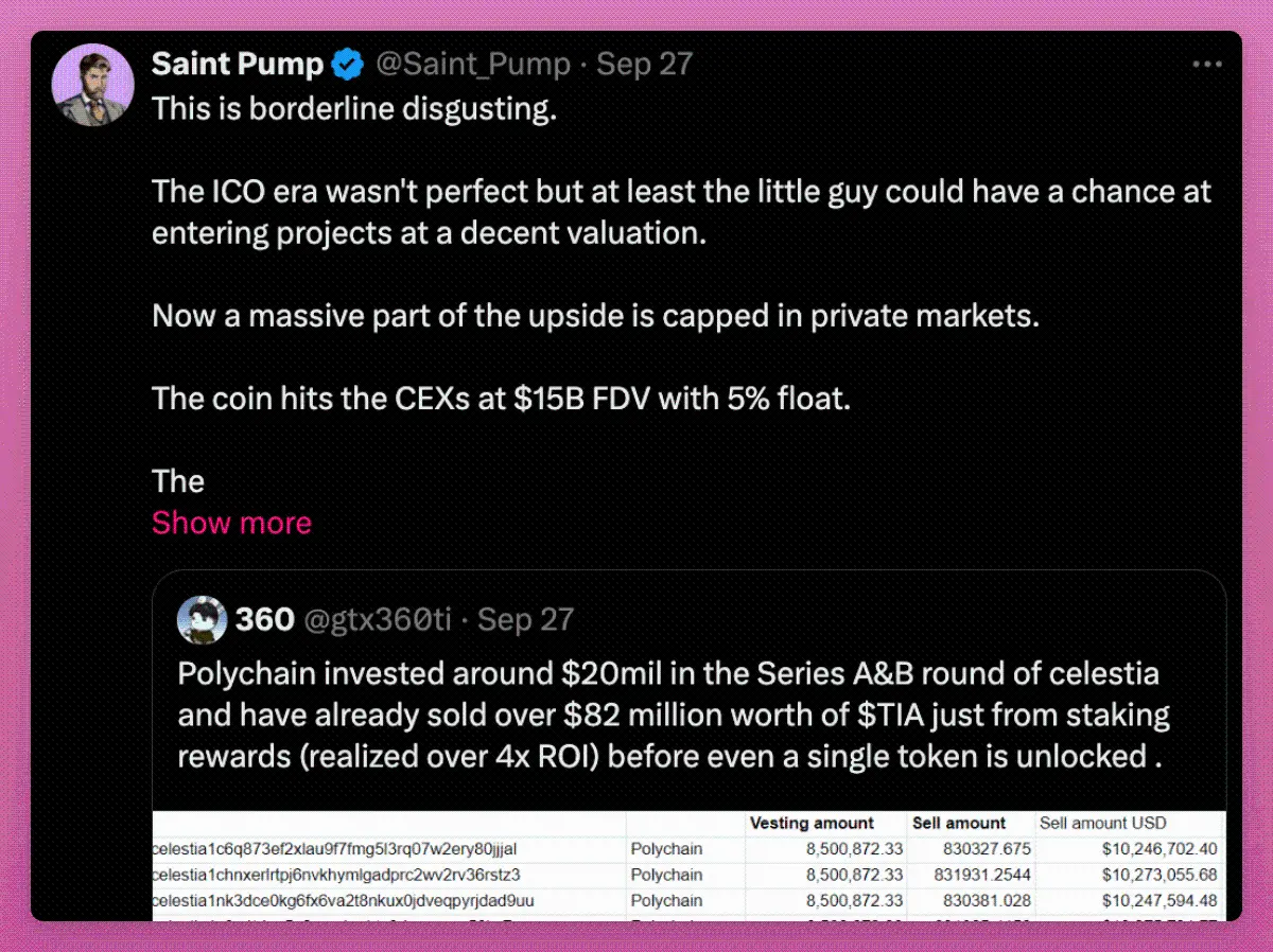 可能最具影响力的加密货币交易员 Cobie 在他 5 月的博客文章中指出,目前加密市场的一个主要问题在于,新的代币发行因为“私人捕获”了上涨空间,使得普通投资者几乎无法参与。