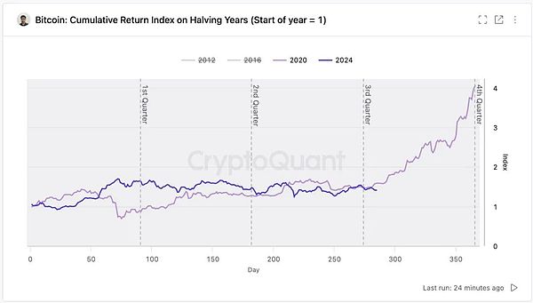 事实胜于雄辩。到现在2024年已经过去了3个季度,BTC既没有提前牛市冲顶,也没有大顶崩溃,横盘整理稳如泰山,不慌不忙更胜以往。对比来看,大结构上,这次减半年和过往历次减半年并无二致;微观上,本次减半后走势更加闲庭信步,如果再过2周还不发动行情的话,那就要创下BTC历史上减半年最长时间的盘整记录了。