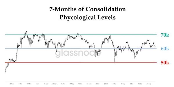 尤其是在过去7个月中,BTC经历了一段健康的盘整期。虽然这对很多3月高位进场的新手而言是一段磨人的考验,但是教链的八字诀可以很好的对付这个问题。很明显的,BTC位于60-70k区间的时间远长于50-60k区间,这还是在历经了许多令人恐惧的抛压和利空考验之后的结果。这显示出了BTC现阶段稳固的基本面,并为下一阶段的向上突破奠定了坚实的基础。一旦市场突破了8万刀,也许再见6万刀的概率就非常小了。