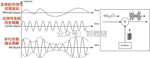 BTC十分钟的出块、4年一次的减半,就像是滴滴答答的时钟,频率一成不变的载波。外部世界的宏观经济和货币周期,美联储政策变化、美元潮汐的冲击也好,社会繁荣萧条、散户进退的投机也罢,都是不太规则的能量波动,是输入信号。输入信号携带能量,被BTC系统吸收和调制。调制后的频率与BTC系统的内生频率相同(周期不变),外部能量则转化成BTC自身的能量。