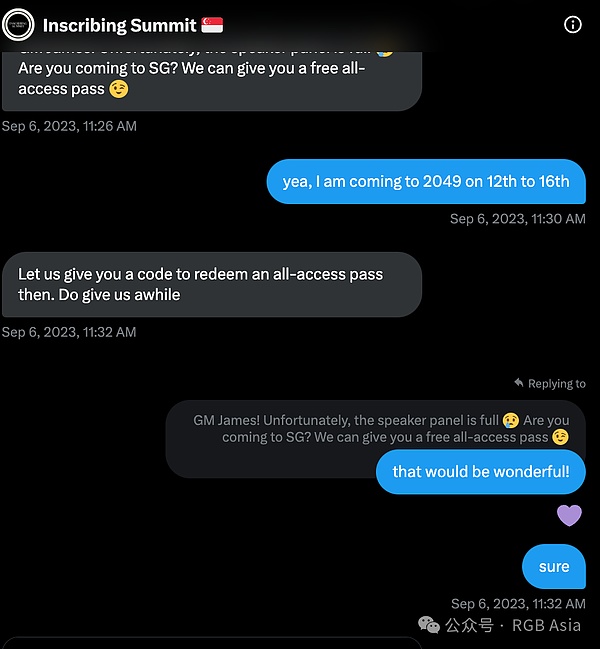 Casey利用了SegWit 放宽了对写入比特币网络内容的大小限制,将铭文内容存储在见证数据中,使其可以存储最大4MB的元数据。所以有了一些小图片“上传”到BTC链,这也是疯狂的开始 (下图是我被受邀,作为第一届2023年7月Ordinals Summit在新加坡的嘉宾,送了我全通票?)。
