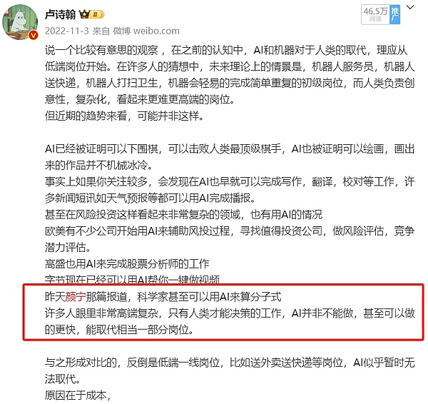 2022年我们讨论AI的时候,AI对于颜宁他们的冲击已经被许多人观察到,从评论区来看,大家虽然都认可AI的发展,但大多认为取代顶尖科学家可能还要一定时间。(有几个小伙伴发言很有前瞻性,非常厉害)