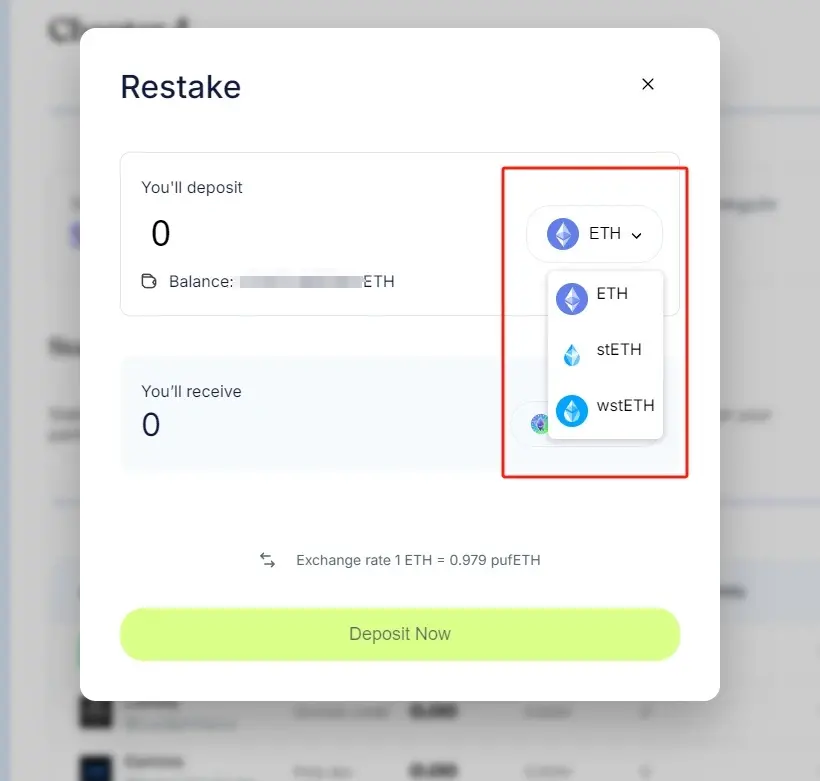 STEP 3. 点击「Stake」后进行质押,可质押 ETH、stETH(从 Lido 质押 ETH 可得 stETH)、wstETH。