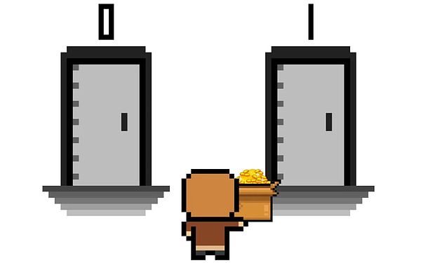 你得选择其中一扇门穿过去。不用有压力,没有奖励也没有惩罚,真就随便选。假设你选了 1 吧。