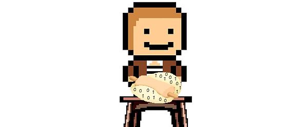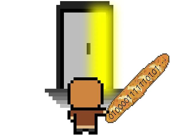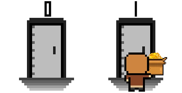 你手里捧着小饭盒,面前有两扇门,左边写着 0,右边写着 1。