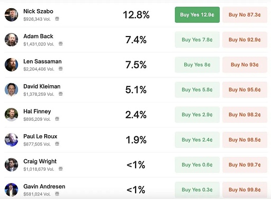 根据上述信息,市场首先挑选出了心目中的中本聪人选,最开始位于押注榜首的是名不见经传的Len Sassaman,其是一名坚持去中心化信仰的密码学者,于2011年自杀。而后POW的发明者Adam Back来到首位,但随着Adam的及时辟谣,最后押注最高的却是Nick Szabo。