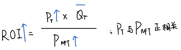当ROI中分母变小时,ROI自然也会变大,那么即NFT作为矿机的获取成本变低。如果是以项目代币交易的NFT价格变低,要么是对于该NFT需求变小供给变多,要么是该代币作为Medium of exchange和standard of measure的价格下降,从外部引起的NFT价格下降。