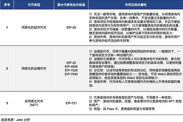 一般认为,链上的代币资产发行的类型有两大类,一类是同质化代币(如 ERC-20 标准支持的代币),一类是非同质化代币(如 ERC-721 标准支持的资产);而在实际应用中,Web3 游戏对于不同类型的代币需求是不一样的,游戏中会用到潜在多种类型的同质化与非同质化代币。代币作为链上的信用符号,不直接制造出财富,仅能够实现财富的转移,转移方向和持续时间取决于钱的属性和耐心。筹码与资产会有独特的属性与定位,最终会依附资产叙事或假设前提。资金的属性决定了会为什么样的叙事和假设买单。下表是对 Web3 游戏中部分潜在需要的代币类型,包括同质化的经济代币、同质化的治理代币和非同质化代币。