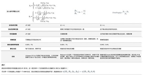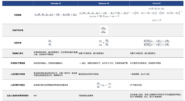 项目方在使用 Uniswap 时,需创建交易对并为交易对注入足够的流动性。在新版本 V3 中,由于在不同价格区间的流动性密度不同,需要对每个同一流动性密度的小区间单独计算。当跨过区间边界时,需要的下一个区间做类似计算。游戏项目方可根据计算,将价格调整到目标价格区间。但项目方在使用 Uniswap 时,需要注意有效与真实的流动性。当价格离开头寸区间时,该头寸的流动性将不再活跃,同时无法获得手续费。在该价格点上,流动性将完全只由一种代币组成,因为另一种代币都被耗尽。如果价格重新进入区间,流动性将再次变得活跃。同时,Web3 游戏项目方可以选择其他 AMM 机制的产品,以下为 AMM 机制产品的横向对比。(亦可应用于其他类型的同质化代币)
