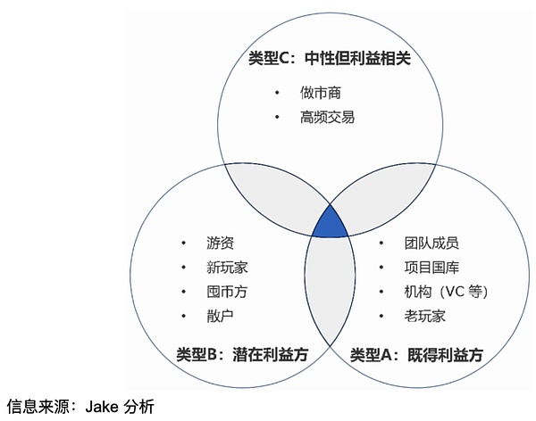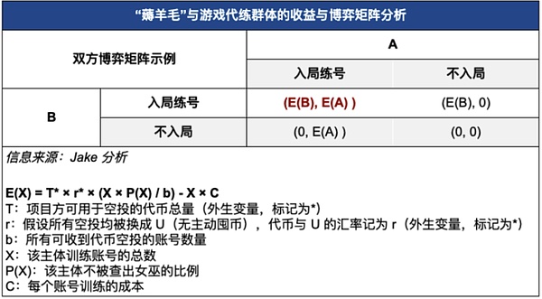 在市场上,项目方一般用 ERC-20 协议发行代币,受协议的限制,发行的代币数量有限且供给的数量固定。用户受到贪婪与恐惧等情绪的影响,逐利的用户对代币的需求会推动代币的价格上涨,会进一步刺激逐利用户购买的需求。已持有代币用户的账面收益会升高。因此,在这种情况下,需求端是驱动币价上涨的主要驱动力。所以,在代币需求端的角度分析,在代币持有的结构上,新代币持有者与既得利益者(已持有用户、项目方、团队成员、投资机构、囤币者等)之间的动态博弈影响了代币的价格。首先优先从双方博弈分析,而后从多方博弈的角度分析。以下表格为简化后的两方「薅羊毛」的矩阵图(后文会有多方博弈分析框架)。考虑到现实项目与工作室的复杂性,因此首先做若干点假设:
