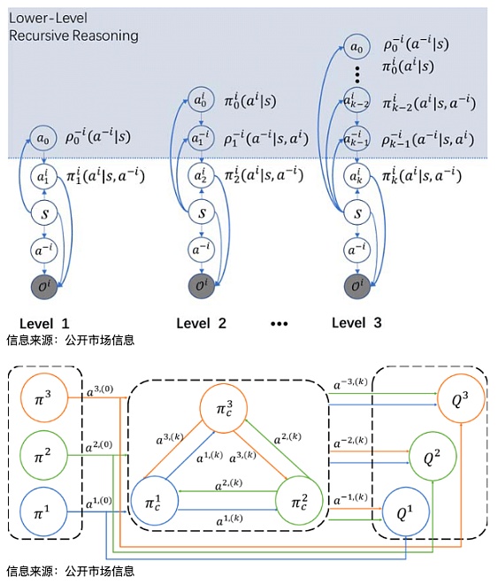 但正如前文所说,代币作为链上的信用符号,不直接制造出财富,仅能够实现财富的转移,转移方向和持续时间取决于钱的属性和耐心。筹码与资产会有独特的属性与定位,最终会依附资产叙事或假设前提。资金的属性决定了会为什么样的叙事和假设买单。同样 100 枚 BTC 是没有差别的,资产背后的属性、偏好与风险不同决定了其地址会做出不一样的行为决策。理解代币的分布结构与对手方,对于代币和经济系统十分重要。AMM 的交易机制也同样能说明这一点。经济学中多重逻辑分析 (K-level Reasoning) 对此种形式下博弈双方的推理和行为有较好的诠释和解析。如下图所示关于 K 阶递归推理图模型的描述。在这个模型中,符号 a 来代表思考的深度。对手方的建模通过函数 ρ-i 来近似逼近。0 阶模型指对手方被视为完全随机的情况。在模型图中,浅蓝色的区域表示智能体 i 进行递归推理的思考过程。每个阶段的计算都包含了上一个阶段的计算结果,更深层次的智能体会回溯并得出当前轮次的最优结果。例如,2 阶模型包含了 1 阶模型的计算结果。在现实生活中,实际情况会远远比模型分析的复杂,此模型仅供读者参考,并不构成投资建议。