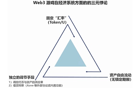 同时,由于传统 Web2 游戏不具备出入金的途径与通道,金融的属性和必要性并未完全在传统游戏中发挥出来,且由于传统技术未能完全显示出资产的所有权、使用权和借贷权等其他权力,Web3 游戏在可发挥的空间上会更强大。在开放的经济系统中,可调动的资源和人员远超封闭性的经济系统。金融属性赋予了游戏内资产更多的灵活性,充分提高用户资产的时间与空间调配能力,并可以将资产的所有权和使用权分离。由于 Web3 代币与资产具有了更大的流动性,因此可具备出入金属性的资产与代币仍需满足 Web3 游戏经济系统的「不可能三角」的条件限制,即在固定汇率(Token/U)、资产和代币自由流动和独立的调节手段(如调节资产与代币的供应量、内部与外部条件下的借贷利率)三个条件中,最多满足两者。因此,在设计游戏经济机制的过程中,Web3 游戏数值策划需突破 Web2 游戏的限制,超越封闭经济的假设前提,在不可能三角中寻求平衡,以实现游戏的数值系统稳定性与金融均衡性。