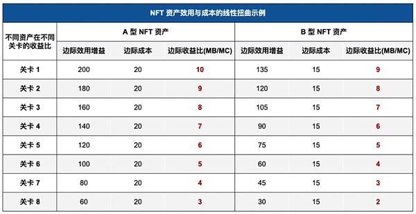 以下表格为 NFT 效用与价格发生扭曲的案例。从关卡 1 至关卡 8 的所有关卡中,A 型的 NFT 资产收益比均高于 B 型的 NFT 资产,因此理性用户会购买 A 型 NFT 资产而非 B 型 NFT 资产。对于项目方来讲,发行 B 型 NFT 资产带来的购买量低,收益低,因此发行 B 型 NFT 资产是完全没有必要的,带来的购买增量会不达预期。