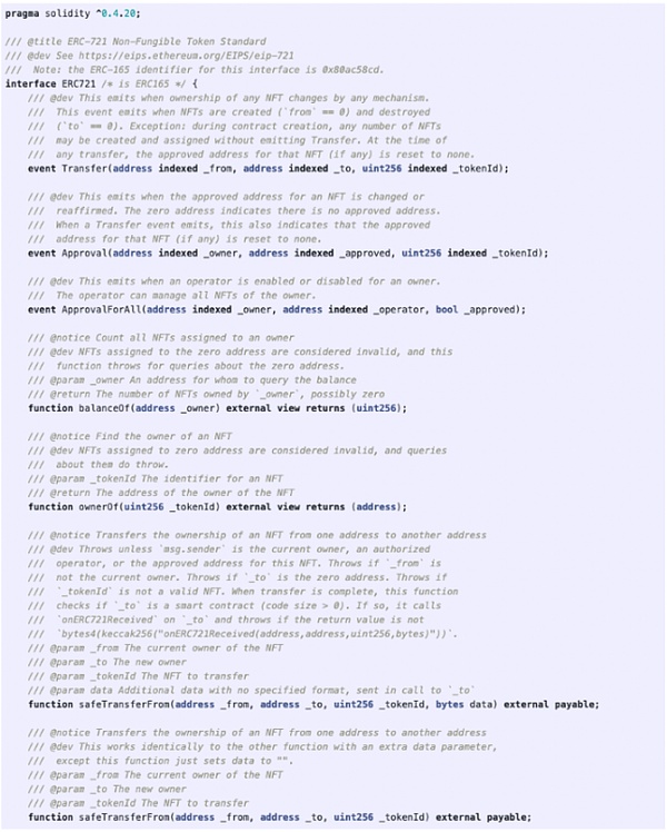 Web3 游戏项目方可以采用常用的 NFT 或 Semi-NFT 资产协议(如 EIP-721、EIP-1155、EIP-3525)作为游戏资产发行的协议标准。但纵览 NFT 或 Semi-NFT 资产协议标准,对数量、地址、字节数据等核心指标均有严格的约束与描述,但从游戏的资产角度看,在协议标准中,缺乏资产的时间限制、折旧与摊销的方式(如加速折旧、匀速折旧、减速折旧等)、折旧与摊销的系数、资产的初始效用参数、利率等指标的设置。其中,利率等指标在 Web3 RPG 游戏中会是潜在待发掘的重要指标之一。当前的 NFT 与 Semi-NFT 资产协议标准均未能完全挖掘出资产的消费品或消耗品的属性,因此在实际操作中,Web3 游戏及其他 Web3 应用同样无法持续激励玩家用户购买与维护资产、持续发挥资产资产的效用。以下为 EIP-721 协议标准的展示。
