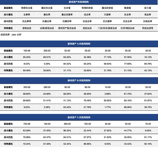 以上为 A、B、C 三种游戏资产案例,在矩阵数据结构中对应的基础属性、战斗属性、战斗抗性及特殊属性均不相同,因此理论上,不同的资产效用在同样的 Web3 游戏(相同的定价机制)中,会有不同的定价。但基于当前资产协议之上的中间件,缺乏对其资产效用的定价机制。除了 Web3 游戏内部资产效用的影响因素,游戏外部影响因素同样会影响 Web3 游戏资产的定价机制,如上文提到的资产的生命周期、资产的折旧与摊销方式、资产的折旧与摊销系数、利率、外部经济环境等。美术因素同样会是影响玩家用户购买的主观因素之一,但目前尚缺乏定量化的指标明确美术因素对于游戏资产效用的外部性补偿。