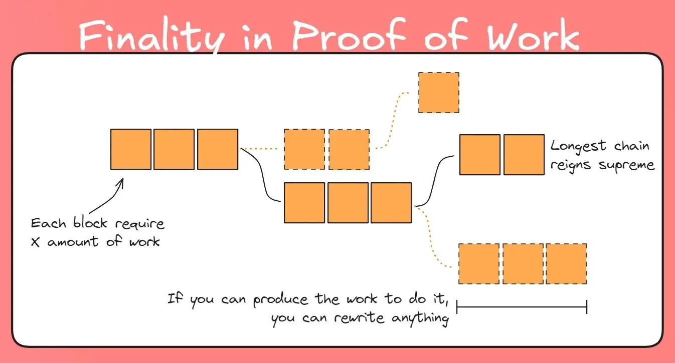 在比特币的 PoW 机制中并没有最终确定性的说法,因为对于它来说,无论是谁都可以在其上产出最长的链并成为主账本。这意味着,尽管有些不切实际,但只要有足够的算力就可以重写比特币历史的最后一天、一周、一年。