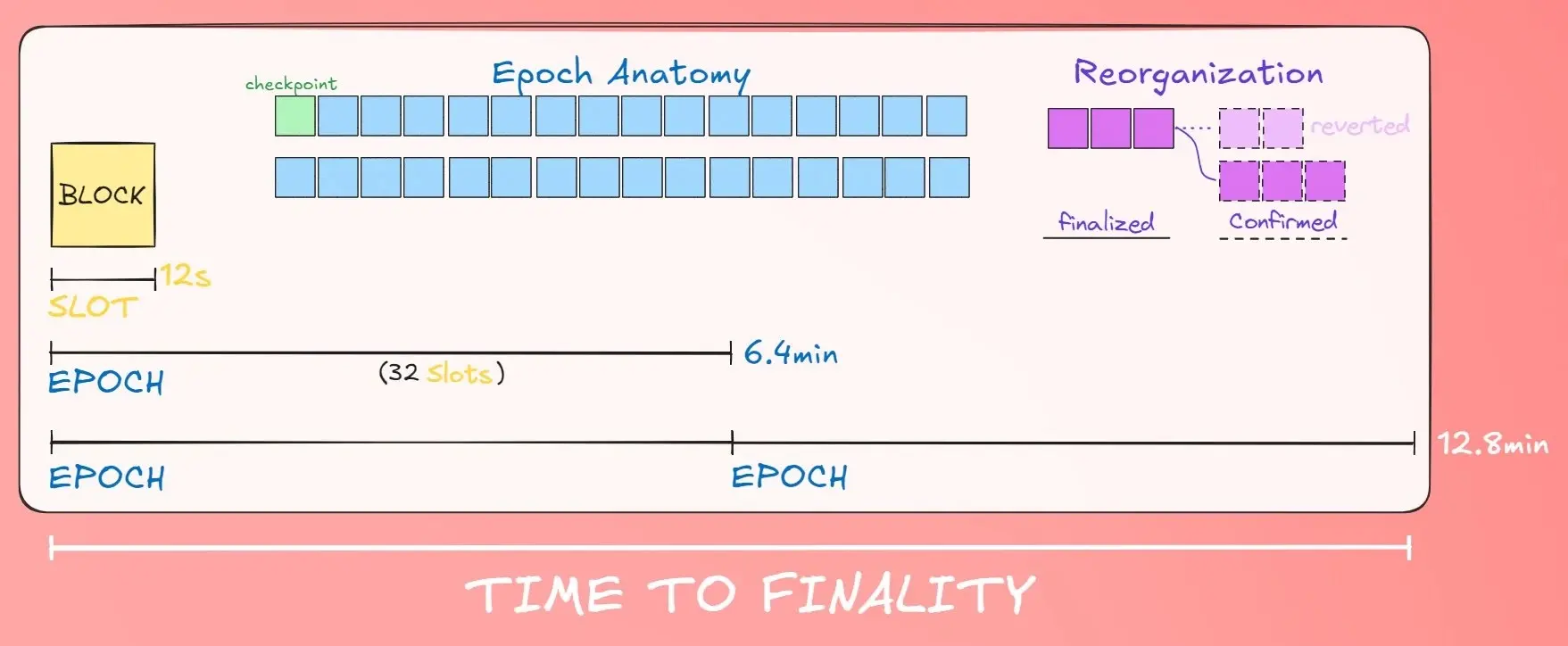 - Epoch:每 32 个 Slots 被称为一个 Epoch。这是区块链中的二级结构,用于委派角色和职责。Slot 用于构建区块,而 Epochs 用于数据传播、奖励分配、验证者选择等。