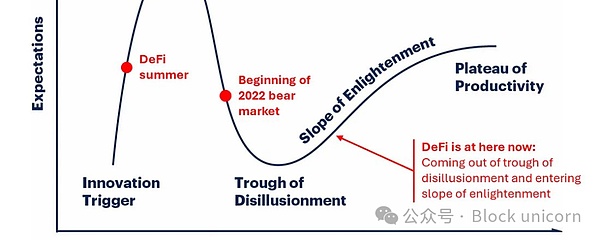 然而,正如任何革命性运动一样,DeFi变得更加坚韧,它成功穿越了“幻灭低谷”,开始攀登“启蒙坡”。Gartner炒作周期(Gartner Hype Cycle)是一个有效的框架,可以很好地说明这一历程,目前DeFi正展现出复苏的迹象。