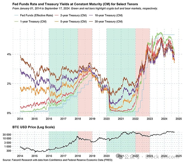 随着美联储在9月份实施了50个基点的降息,市场正在为一个可能是低利率的时期做好准备,类似于推动2017年和2020年加密牛市的环境,正如下图所示。比特币(以及加密货币)牛市在绿色区域中显示,通常出现在低利率环境中,而熊市则在红色区域中显示,通常发生在利率飙升的时期。