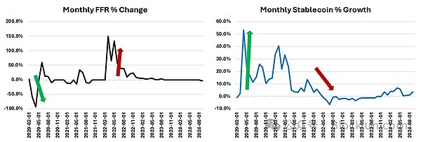 此外,我们预计新的利率周期将成为推动稳定币增长的重要因素,因为它大大降低了传统金融(TradFi)资金进入DeFi寻求收益的资本成本。在上一个周期中,联邦基金利率(FFR)与稳定币供应增长呈反向关系,如下图所示。随着利率再次下降,预计稳定币供应将增长,为DeFi的加速发展提供更多资金。