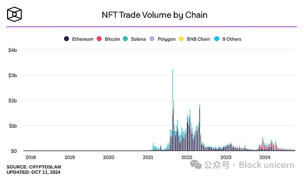 例如,尽管2024年因比特币Ordinals带来了一次短暂的复苏,NFT的日交易量仍在持续下降。