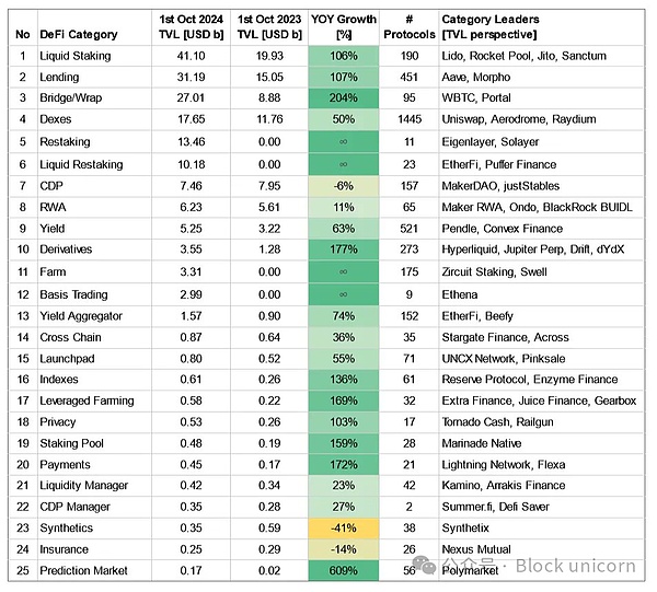 相比之下,DeFi已经证明了它的产品市场契合度。核心DeFi类别如流动质押和借贷的增长,年同比扩展了超过100%,这是其强大吸引力的证明。同时,诸如重质押(Eigenlayer)和基差交易(Ethena)等全新、价值数十亿的类别正在涌现,而它们一年前的总锁仓量(TVL)几乎为零。这种爆炸性的增长展示了DeFi的可组合性和无许可特性,在DeFi中,新型金融“乐高”可以相互叠加,从而解锁新的应用场景。