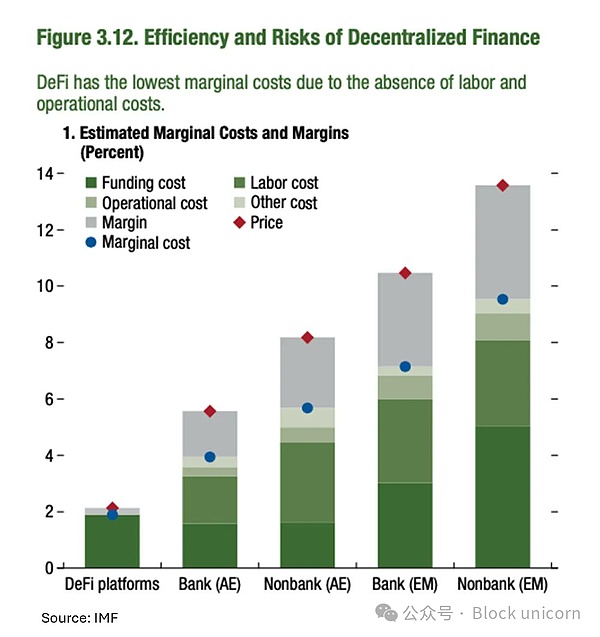 为了展示DeFi在效率上如何优于TradFi,我们来对比一下两者在运行服务时的成本。根据国际货币基金组织(IMF)的一项研究,以下是成本细分: