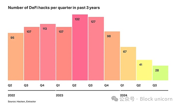 在安全性方面也有所提升,在智能合约部署前进行更彻底的审计已成为标准。像ImmuneFi这样的平台通过漏洞赏金激励道德黑客发现漏洞和安全问题,确保在漏洞被利用之前得到解决。这些在钱包基础设施和安全性方面的进展使DeFi对所有用户来说变得更安全、更高效,这一点也反映在过去一年中DeFi黑客事件的大幅减少。