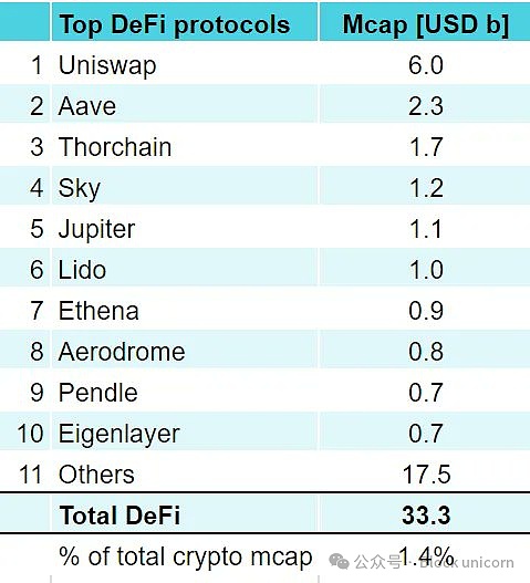 目前,所有DeFi协议的总市值约为330亿美元,只占加密货币总市值(2.3万亿美元)的约1.4%。