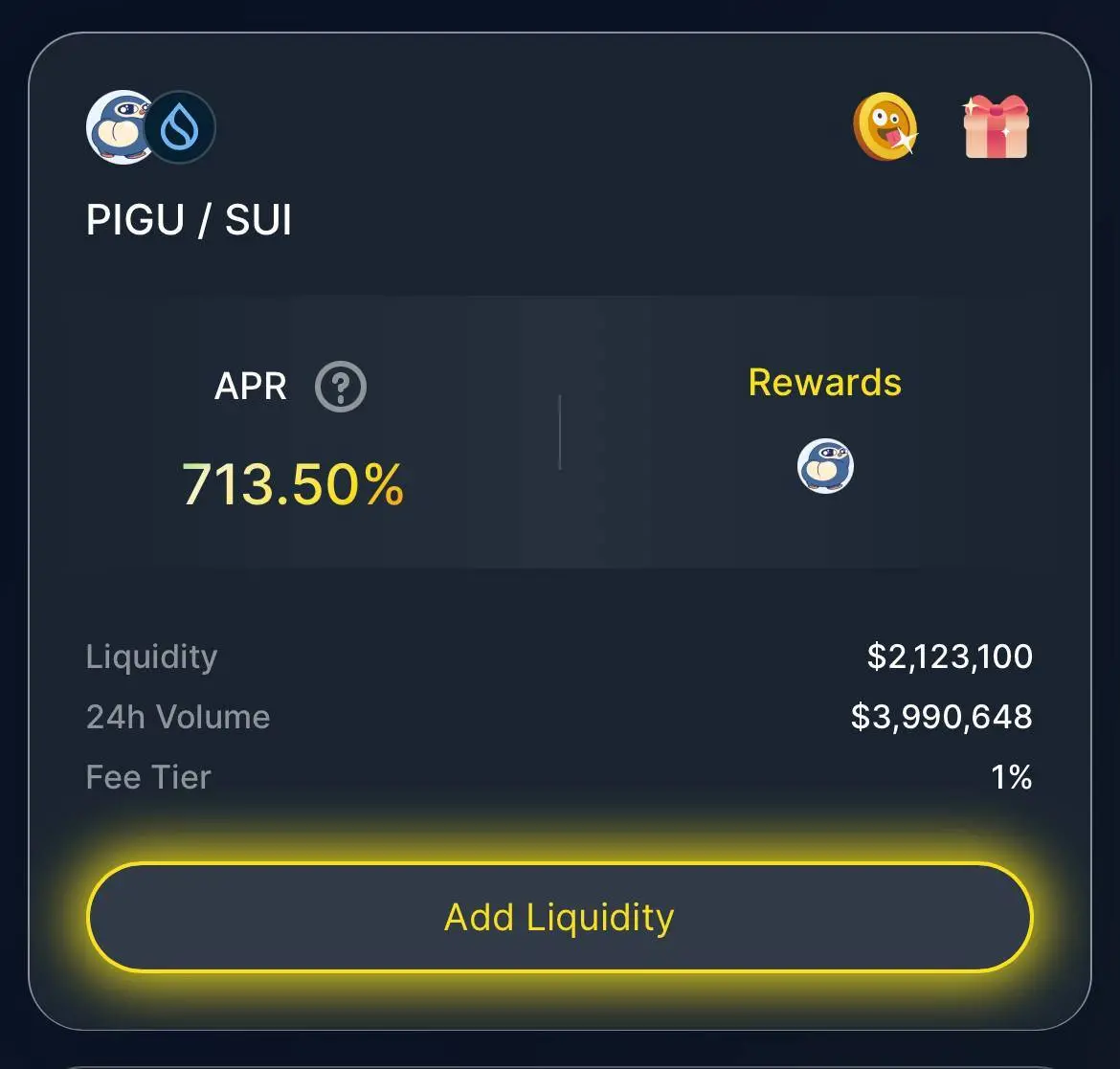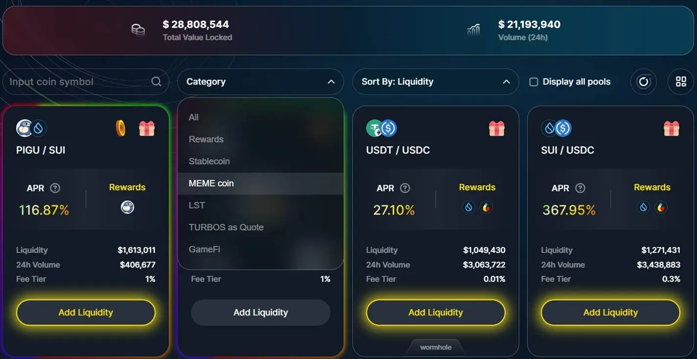 在 Memecoin 的合作上,Turbos 不仅要求数量,更看重质量。$BLUB、$FUD、$PIGU 等 Sui 生态明星 Meme 项目都选择在 Turbos 独家首发上线,同时为 Turbos 用户提供交易奖励等激励活动,直接赋能平台代币 $TURBOS。例如 10 月 9 日在 Turbos 独家首发上线流动池的 $PIGU,上线当日成交量达 400 万美元,同时当日提供年化高达 750% 的额外 $PIGU 流动性激励。