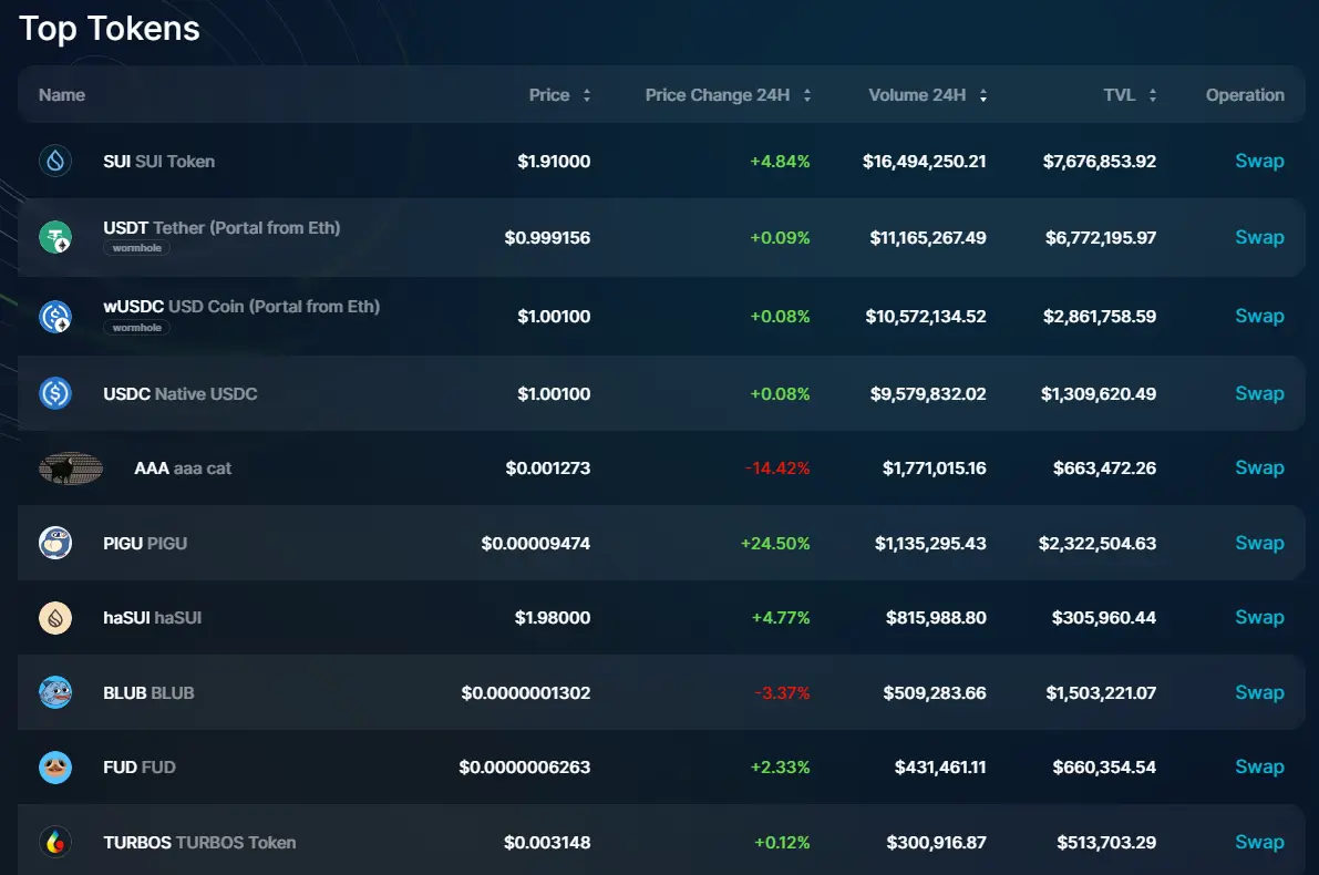同时,Sui 生态内排名前十的代币均选择在 Turbos 上线,无论是 Meme 还是稳定币,在 Turbos 几乎是有求必应。
