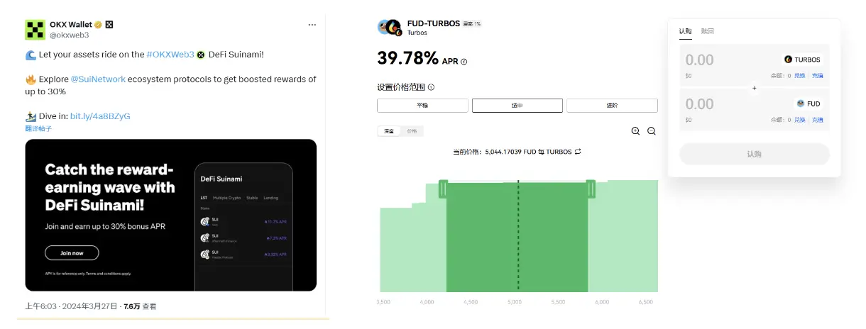 在平台自流量引导之外,Turbos 还与中心化交易所联动推出流动性激励活动,将 Meme 代币的浪潮和交互体验延伸至 CEX 用户。早在今年四月,Turbos 就参与 OKX Wallet 的 DeFi Suinami 活动,通过添加自家代币 or Memecoin 流动性获取奖励。为用户带来额外激励、为合作的 Meme 项目带来额外的流动性曝光量的同时,还将交易所用户与丰富的去中心化链上世界相连接。