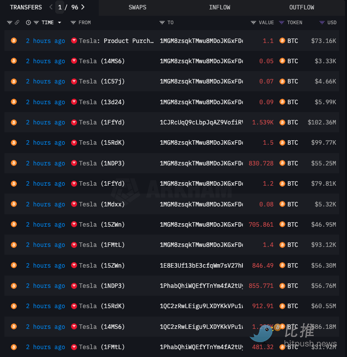 据 Arkham Intelligence 数据,UTC 时间 10 月 15 日 21:30 左右,与特斯拉关联的地址分批将价值约 7.65 亿美元的 BTC(11509 枚)转移到多个未知钱包,这似乎是该公司剩余的全部比特币储备。