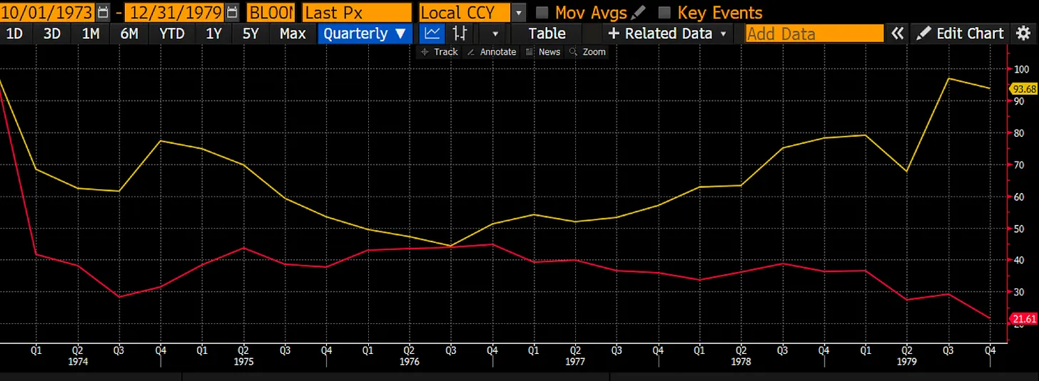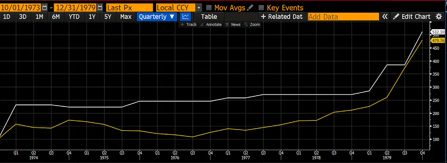 1973 年至 1982 年期间,石油现货价格(白色线)和黄金价格(黄色线)相较于美元价格走势(以 100 为基准)显示出相似的上涨趋势。石油价格在此期间飙升了 412%,而黄金几乎与之匹配,涨幅达到了 380%。